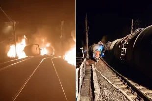 На железной дороге возле границы Свердловской области и Пермского края загорелись цистерны с нефтепродуктами.