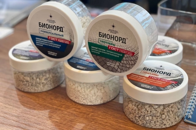 Центральное место в экспозиции заняла линейка противогололедных материалов «Бионорд», включающая четыре специализированных состава: «Универсальный», «Жидкий», «Двухфазный» и «Тротуары». Каждая из формул разработана с учётом определенных типов покрытий и климатических особенностей российских регионов. Материалы сохраняют эффективность при многократном переходе температуры через нулевую отметку, начинают работать сразу после нанесения и препятствуют повторному образованию наледи, что существенно сокращает количество обработок. Антикоррозионные добавки в составе защищают металлические элементы транспорта и городской инфраструктуры от разрушительного воздействия солей.