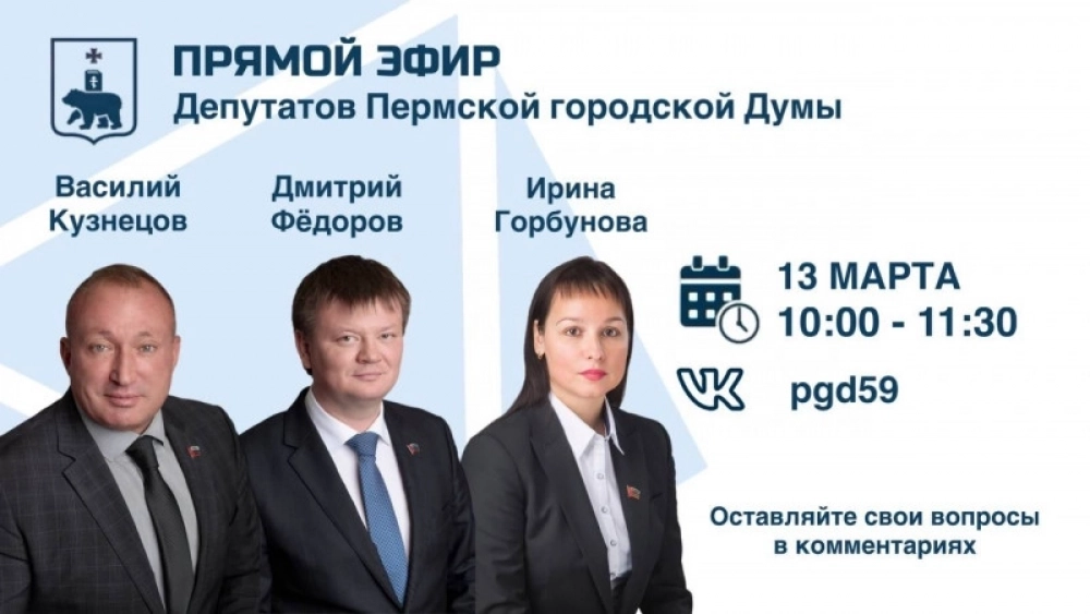 13 марта в официальном сообществе Пермской городской Думы «Вконтакте» пройдёт прямой эфир с участием представителей городского депутатского корпуса.