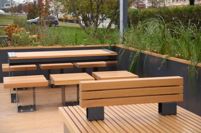 Проходя мимо таких конструкций, пермяки могут «замедлиться», отдохнуть, пообщаться, оценить, как украсили территорию вокруг новые кустарники, деревья и свежий газон – озеленение, конечно же, входило в план благоустройства.