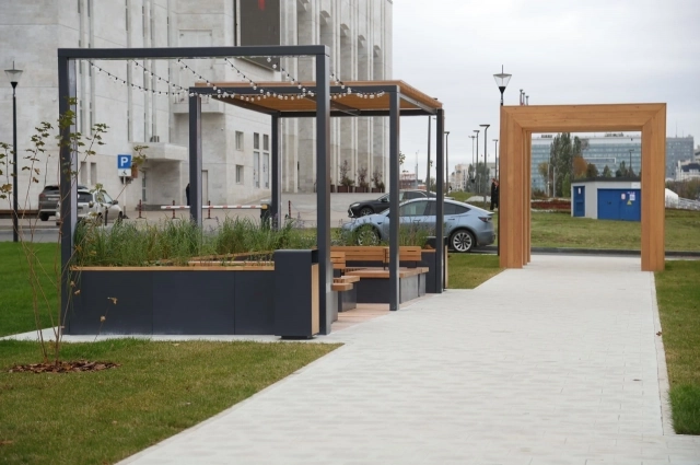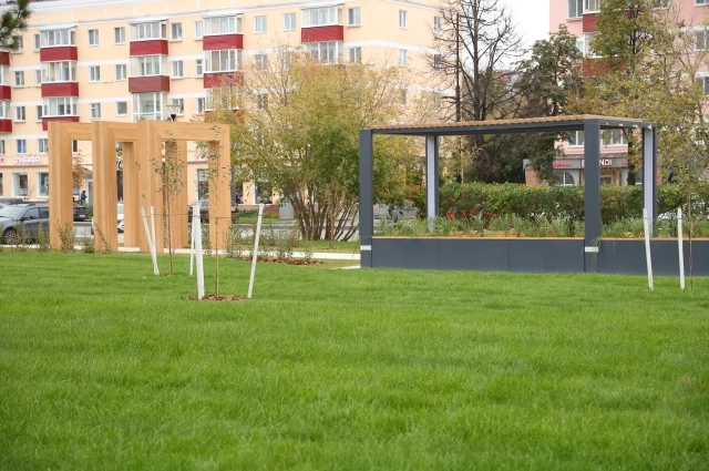 В обновлённом сквере установили сцену и малые архитектурные формы. Среди последних есть парклеты — конструкции зоны отдыха с сидениями, столами и навесом. Их украшают гирлянды, которые включаются вечером.