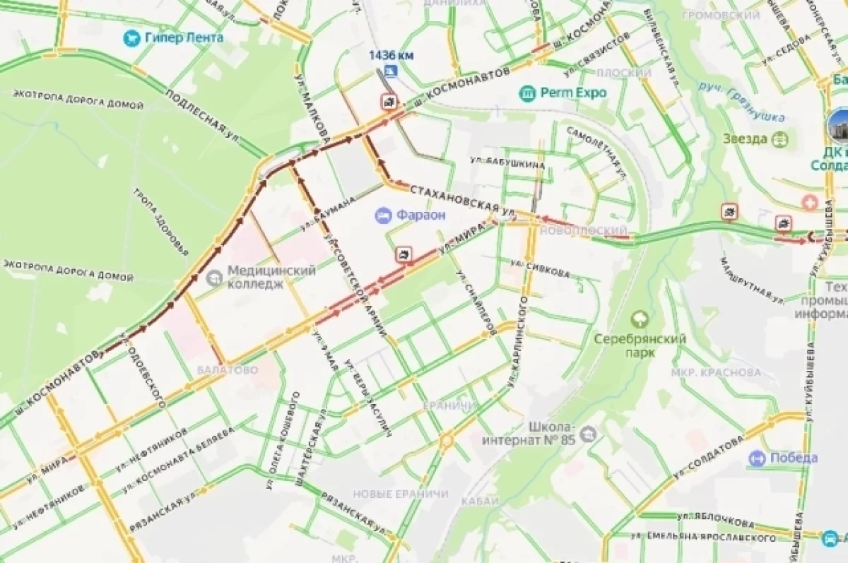 Инцидент произошёл в Индустриальном районе краевой столицы утром 27 октября. Около 9 часов утра на шоссе Космонавтов образовался затор, растянувшийся от улицы Стахановской до улицы Космонавта Леонова. На протяжении всей пробки движение окрашено в бордовый цвет. В районе переезда через Транссибирскую магистраль установлена отметка о ДТП.