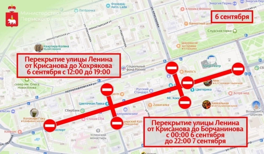 Кроме того, все выходные (до 22:00 7 сентября) останется полностью закрытым для движения участок улицы Ленина от Борчанинова до Крисанова. А с 12:00 до 19:00 6 сентября перекроют ещё и участок от Крисанова до Хохрякова.