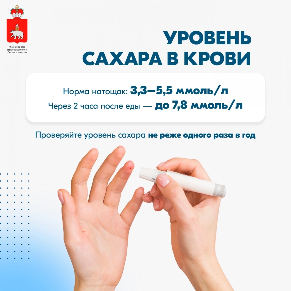 Нормальное значение уровня сахара в крови у здоровых людей натощак — не менее 3,3 и не более 5,5 ммоль/л. Через 2 часа после употребления пищи количество глюкозы в норме не должно превышать 7,8 ммоль/л.