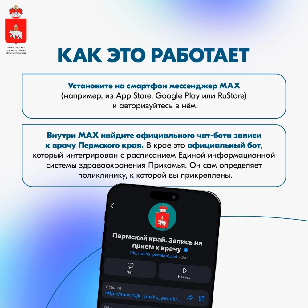 Теперь прикамцам стал доступен ещё один способ дистанционной записи на приём к доктору. Помимо Госуслуг и регионального портала «К врачу», запущен официальный бот в национальном мессенджере Мax.