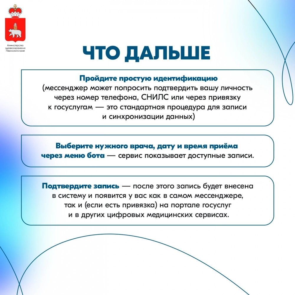 В министерстве здравоохранения Пермского края отметили, что чат-ботом не смогут воспользоваться только граждане, прикреплённые к поликлиникам ФМБА России (бывшие МСЧ №133 и №140). Для них, как и раньше, есть возможность записи к врачу через Госуслуги.