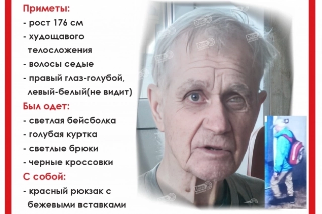 В день пропажи был одет в серую кепку, голубую ветровку, бежевые штаны и чёрные ботинки. При себе также имел красный рюкзак с бежевыми вставками. Уточняется, что мужчина нуждается в медицинской помощи.