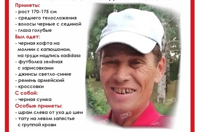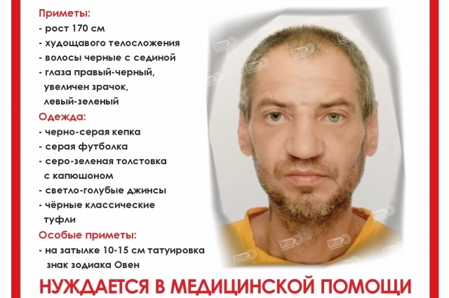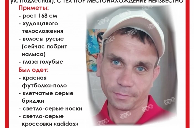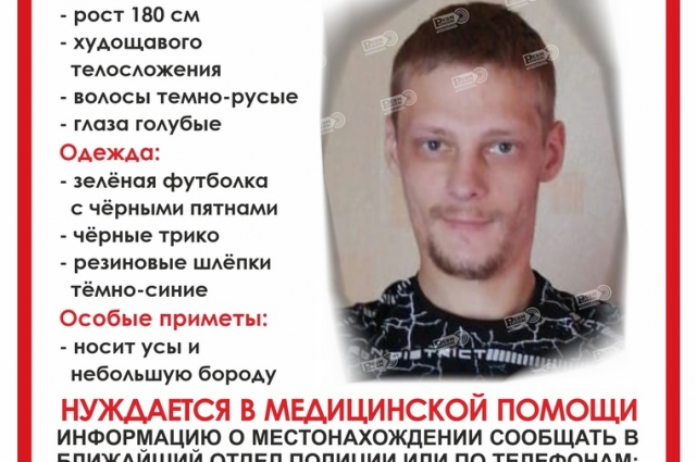Приметы — на вид 35 лет, рост 180 см, телосложение худощавое, русые волосы, усы и борода, голубые глаза. В день пропажи был одет в синюю удлинённую куртку, зелёную футболку с чёрными пятнами, чёрную шапку и тёмные штаны. На ногах были резиновые шлёпки тёмно-синего цвета. Уточняется, что мужчина нуждается в медицинской помощи.