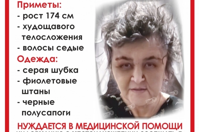 Приметы — рост 150 см, телосложение худощавое, седые волосы и голубые глаза. В день пропажи была одета предположительно в белый берет, чёрную куртку с белой полоской, коричневые штаны в крапинку и демисезонные чёрные ботинки. Уточняется, что женщина нуждается в медицинской помощи.