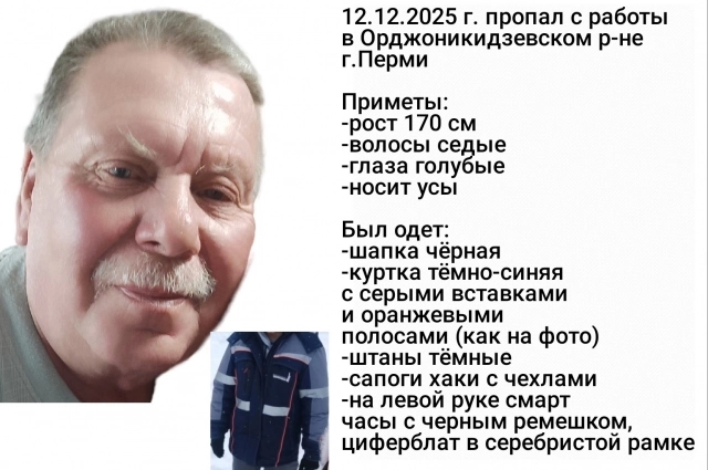 64-летний мужчина пропал с работы в Орджоникидзевском районе Перми 12 декабря 2025 года. Его местонахождение до сих пор неизвестно.
