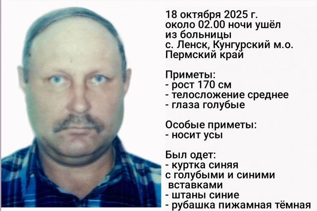 63-летний мужчина ушёл из больницы села Ленск Кунгурского муниципального округа 18 октября 2025 года около 2:00. Его местонахождение до сих пор неизвестно.