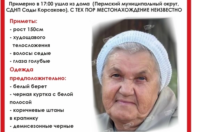 85-летняя женщина ушла из дома в СДНП Сады Корсаково Пермского муниципального округа 12 сентября 2025 года примерно в 17:00. Её местонахождение до сих пор неизвестно.