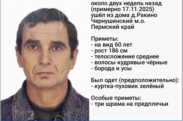 73-летний мужчина ушёл из дома в деревне Ракино Чернушинского муниципального округа примерно 17 ноября 2025 года. Его местонахождение до сих пор неизвестно.