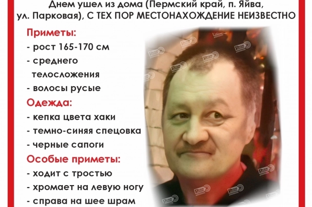 57-летний мужчина ушёл из дома на улице Парковая в посёлке Яйва 26 августа 2025 года. Его местонахождение до сих пор неизвестно.