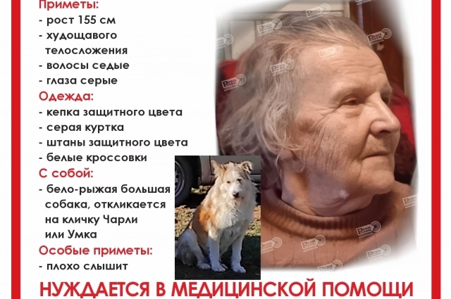 Приметы — на вид 88 лет, рост 155 см, телосложение худощавое, седые волосы, серые глаза. В день пропажи была одета в серую куртку, белые кроссовки, штаны и кепку цвета хаки. При себе имела пакет и ножик. Уточняется, что женщина нуждается в медицинской помощи и плохо слышит.