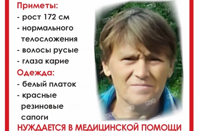 Приметы — на вид 55 лет, рост 172 см, среднего телосложения, русые волосы, карие глаза. В день пропажи была одета в белый платок, камуфляжную куртку и красные резиновые сапоги.