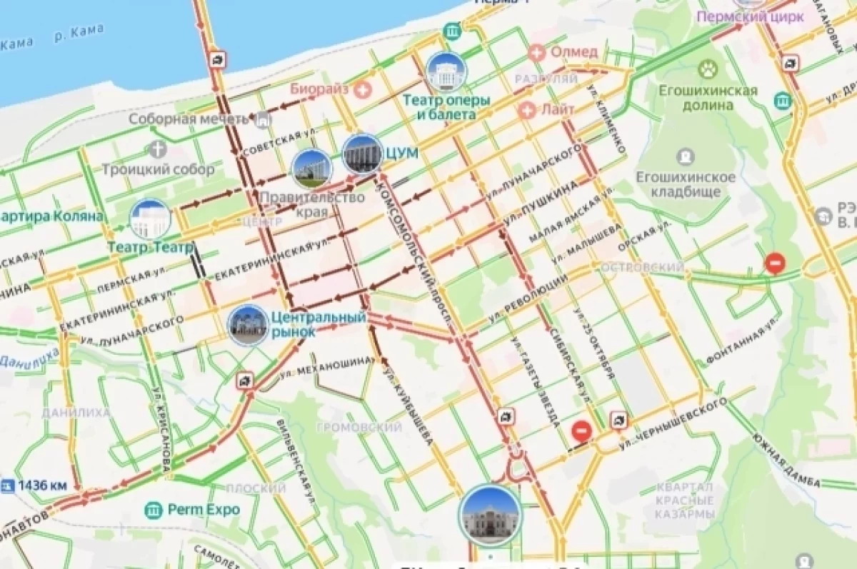 В сервисе «Яндекс пробки» видно, что на Комсомольском проспекте в районе «Башни смерти» произошло ДТП в левом ряду. Также заторы в несколько кварталов видны на улицах Пушкина, Екатерининской, Луначарского, Сибирской, Спешилова. Большой затор образовался и на подъезде к Камскому мосту.