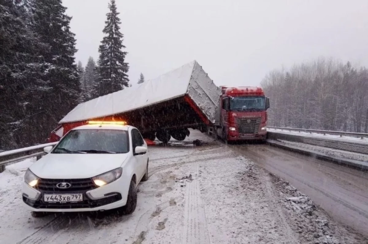 Утром 14 декабря на 231-м километре автомагистрали в Нижнесергинском районе опрокинулся большегруз, из-за чего образовалась 15-километровая пробка.