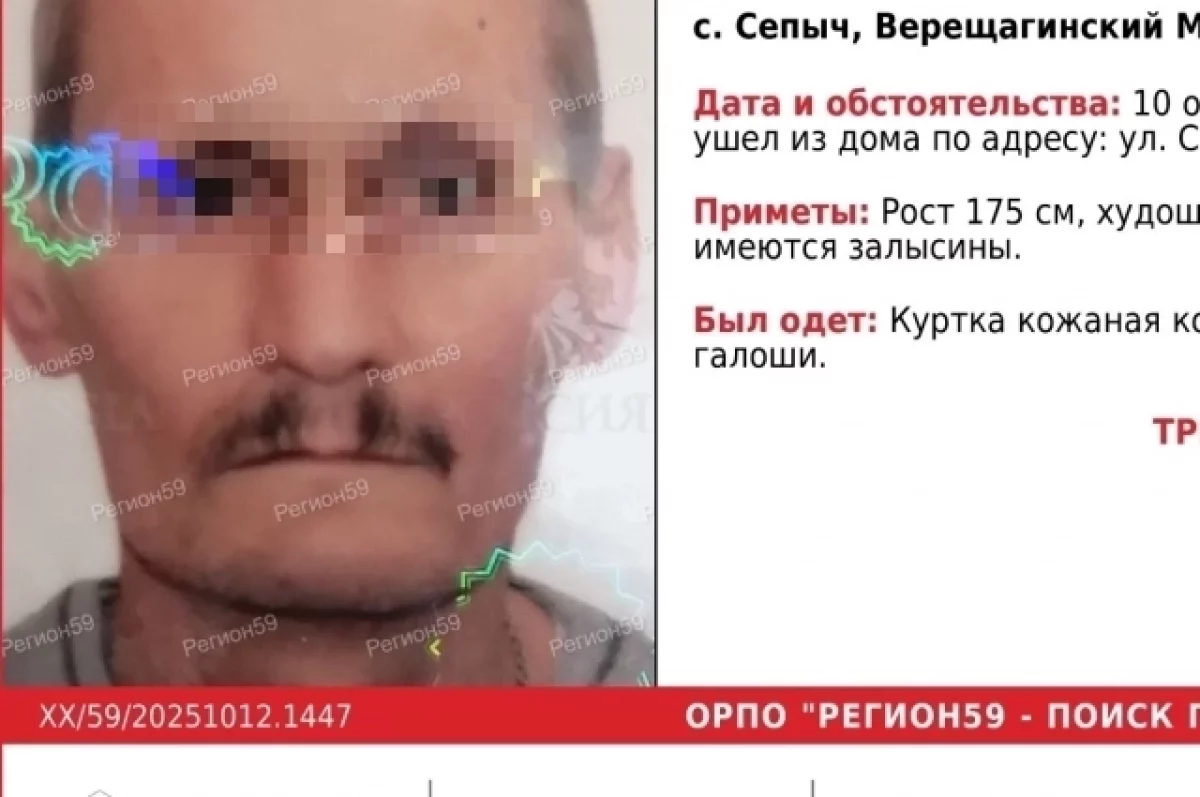 Речь идёт о мужчине, который исчез 10 октября 2025 года. 48-летний житель села Сепыч (Верещагинский округ) ушёл из дома в утреннее время и перестал выходить на связь с близкими. В последний раз его видели на улице Сосновой. Спустя три дня волонтёры опубликовали ориентировку на пропавшего мужчину и объявили срочный сбор на его поиски. Уточнялось, что пропавший нуждается в медицинской помощи.