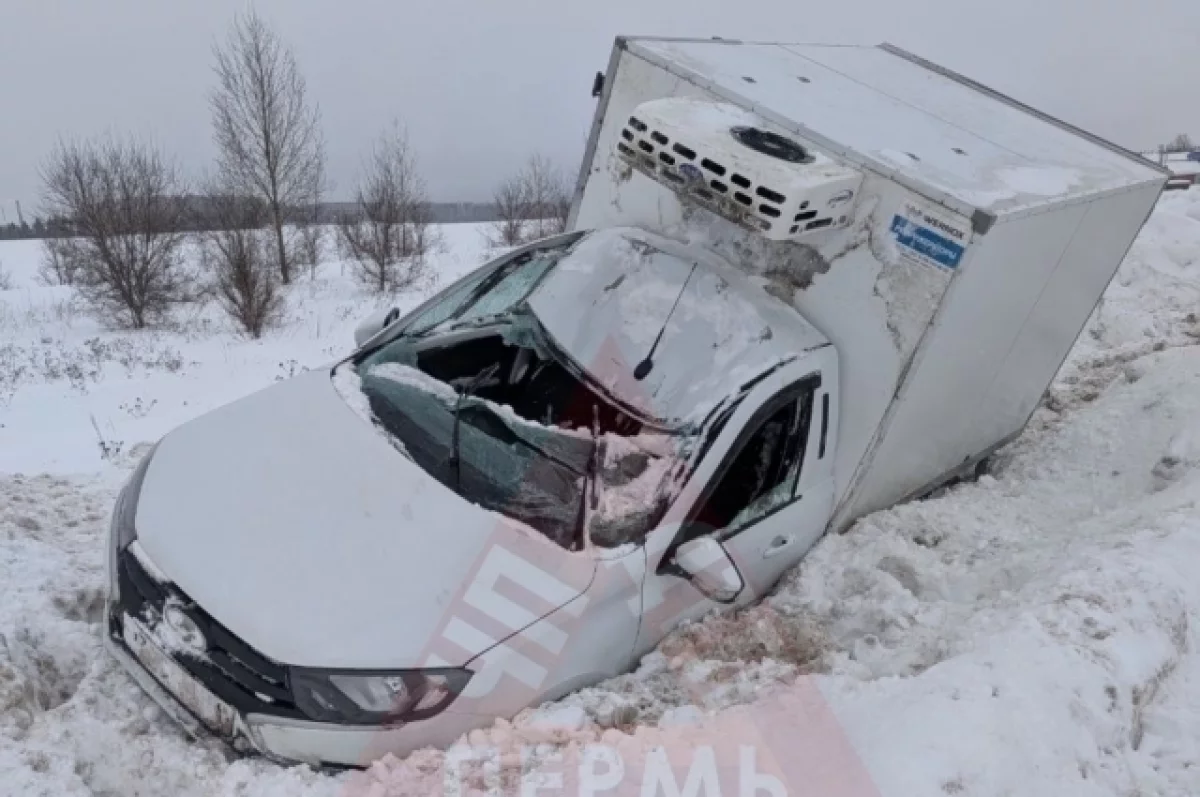 Инцидент произошёл 17 февраля в районе деревни Липаки на Южном обходе краевой столицы. Лёд упал с такой силой, что смял кабину.