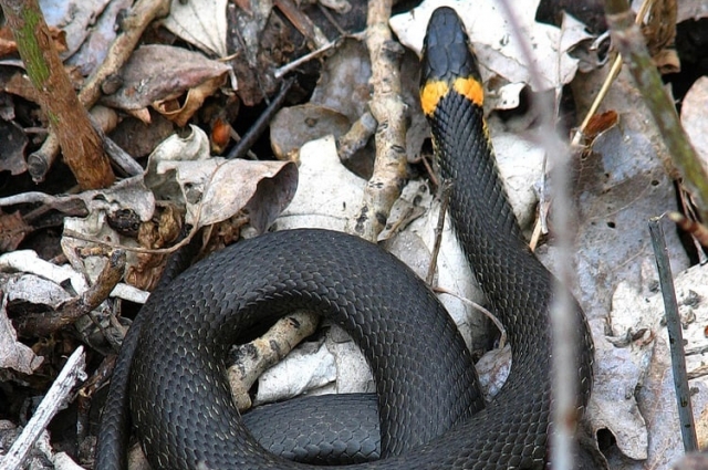 «Это крупная змея до 120 сантиметров в длину, обычно тёмного цвета. Его легко узнать по двум ярким жёлтым или оранжевым пятнам на голове. Ещё один признак: у ужа нет чётко выраженной шейки, голова плавно перетекает в туловище», — поясняет Мария Комбарова.