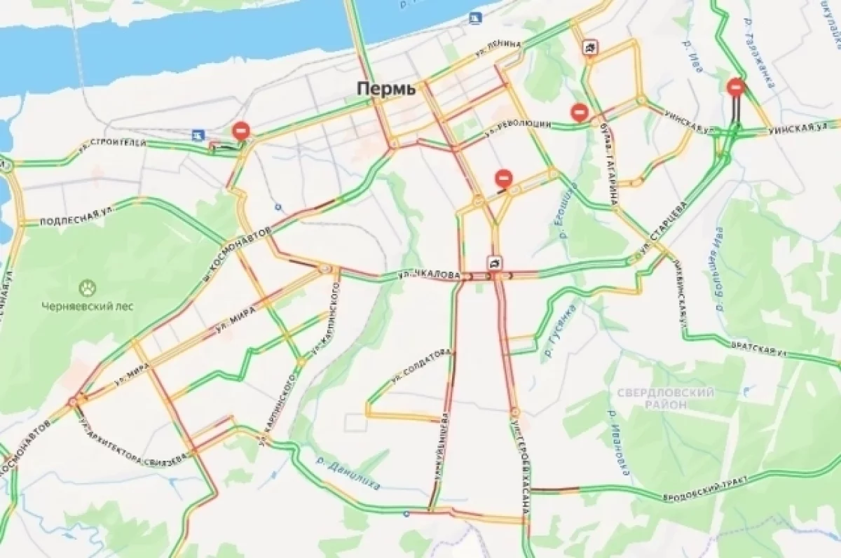 Улицы и дороги сковали 8-балльные вечерние пробки в разных частях Перми, сообщает сервис Яндекс.Карты.