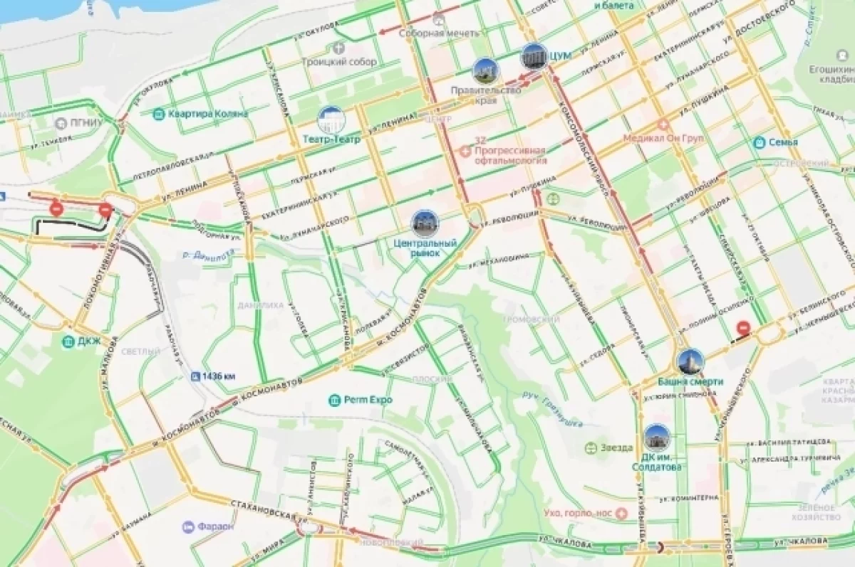 Согласно данным сервиса Яндекс.Карты, проблемы возникли как на пути в центр города, так и на главных улицах. К 9:20 часам движение на Комсомольском проспекте было окрашено в красный цвет. Ещё одна пробка также заметна на шоссе Космонавтов в районе Гознака и перекрёстка с улицей Стахановской.