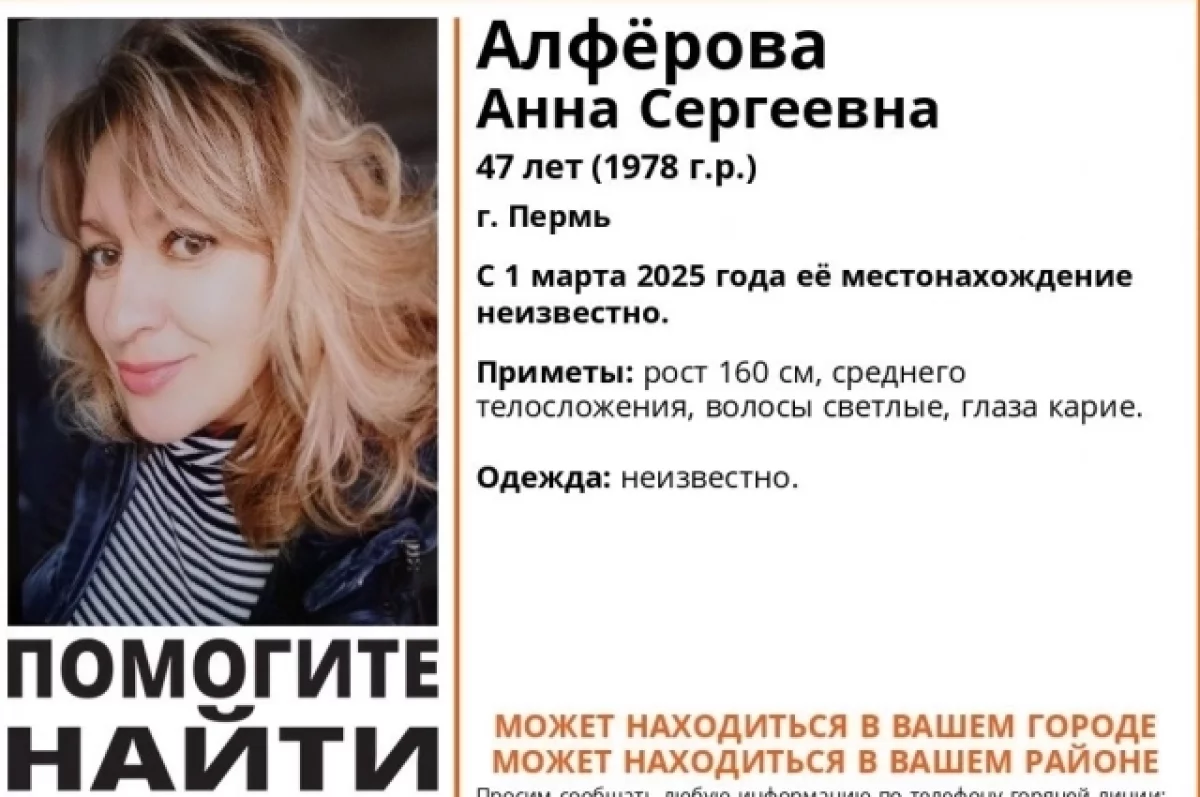 Сообщение о пропаже 47-летней пермячки было опубликовано в социальных сетях 15 декабря. Как рассказывает организация, Анна Алфёрова исчезла в краевой столице весной 2025 года. В последний раз её видели 11 марта. С того момента местонахождение женщины остаётся неизвестным.