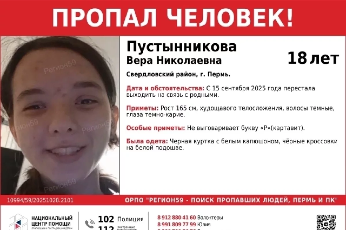 18-летняя Вера Пустынникова пропала в Перми в сентябре, сообщили в отряде «Регион59 — поиск пропавших людей».