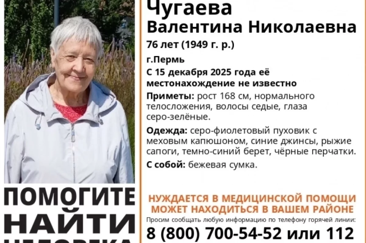 По данным «ЛизаАлерт» в Пермском крае, местонахождение пенсионерки неизвестно с 15 декабря. Ранее в постах о её розыске в соцсетях сообщалось, что в последний раз с ней общались в 11:19, а примерно с 16:00 она не выходила на связь — таким образом, информации о ней нет уже больше суток. При этом в постах упоминалось, что у женщины деменция. Поисковики подчёркивают, что она нуждается в медицинской помощи.
