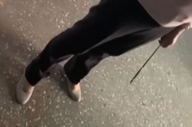В прикреплённом ролике видно взрослую женщину, которая за руку тащит девочку, одетую в чёрное. Вместе они двигаются в сторону школьного туалета. На другом видео, снятом в тот же день, педагог с указкой в руках заставляет девочку зайти в кабинет, перегораживая ей путь.