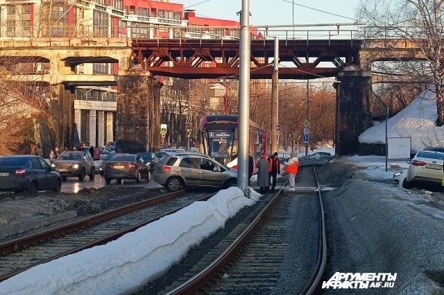 Машина, застрявшая на рельсах, перегородила дорогу трамваям в Перми, рассказал очевидец сайту perm.aif.ru.