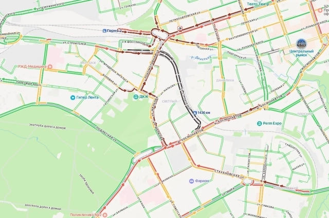 Согласно данным сервиса Яндекс.Карты, к 9 часам утра бордовым и красным цветом оказались окрашены шоссе Космонавтов (в районе Гознака), улицы Малкова, Локомотивная, Строителей и улица Ленина, а также сама площадь Гайдара. Возле площади установлено две отметки о ДТП, а также сообщение от пользователя, в котором водитель указал, что на кольце образовался коллапс.