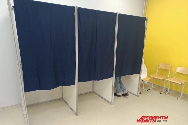 На участке необычные шторы в кабинках (обычно встречаются белые с гербом). Члены комиссии объясняют: что у них на УИКе всё как полагается — шторы непрозрачные.