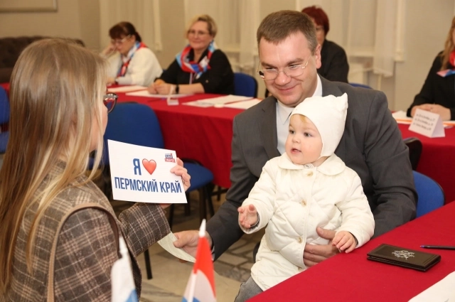 Мэр Перми Эдуард Соснин пришёл на избирательный участок с женой и младшей дочкой. Девочка сидела у него на коленях, пока он подавал документы для получения бюллетеня.