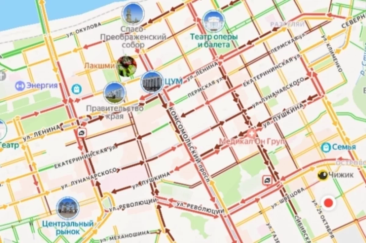Судя по данным онлайн-сервиса «Яндекс-карты», на 19:25 в Перми, к примеру, затруднено движение почти по всей улице Попова (от кольца на улице Революции до Монастырской), по улице Ленина от улицы Попова и до Разгуляя, улице Пермской от Разгуляя до Газеты Звезда, по Комсомольскому проспекту от улицы Ленина до улицы Революции, по улице Сибирской от Монастырской до «Дома Офицеров» (между Швецова и 1-й Красноармейской). Кроме того, «стоит» улица 25 Октября от Петропавловской до Тимирязева.