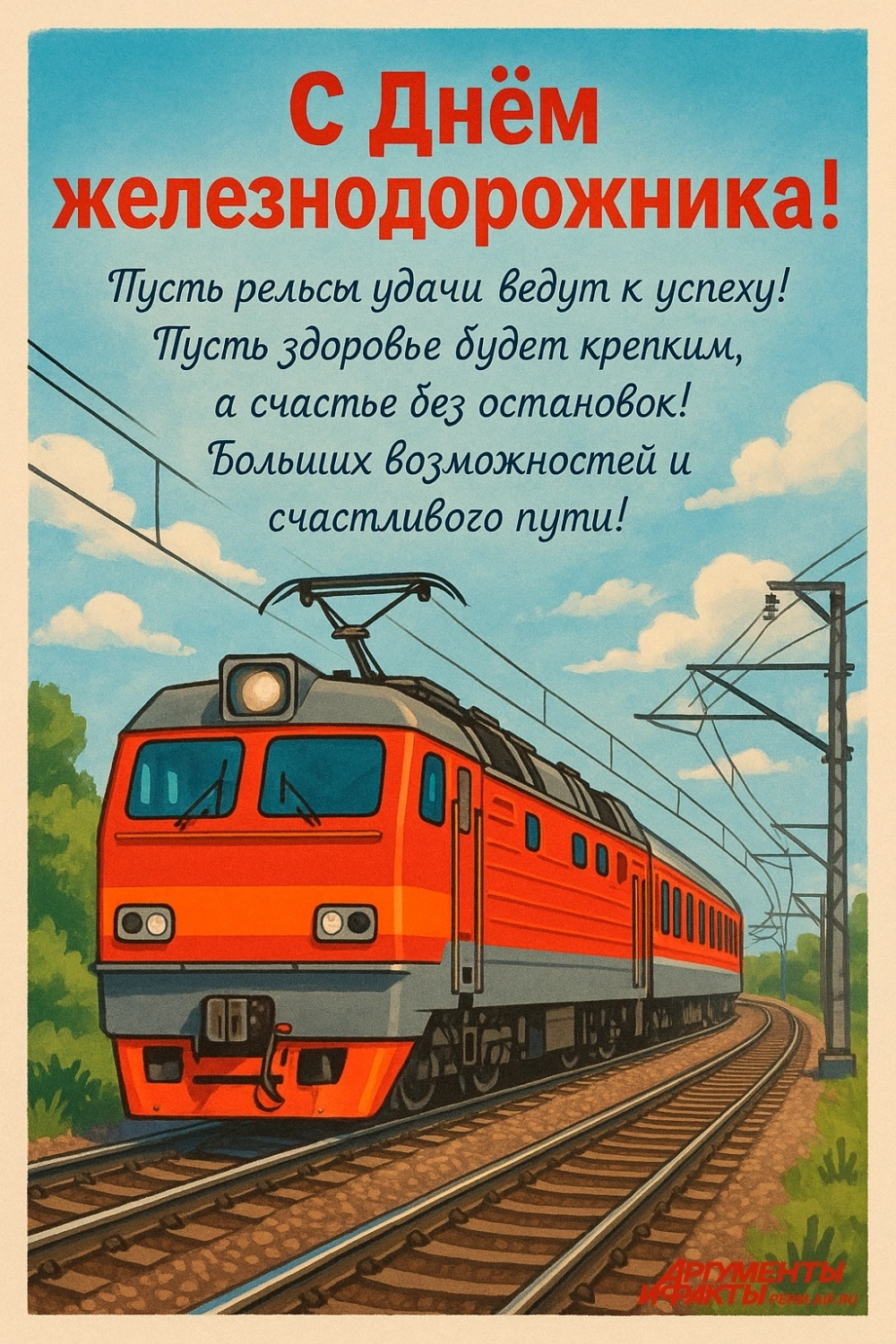 3 августа 2025 года в Росии отмечается День железнодорожника. Это профессиональный праздник, посвящённый признанию заслуг сотрудников железнодорожного транспорта, на котором принято отмечать успехи и достижения всей отрасли в целом. Сайт perm.aif.ru публикует открытки-поздравления с Днём железнодорожника (открытки разворачиваются при клике на них для удобного скачивания).
