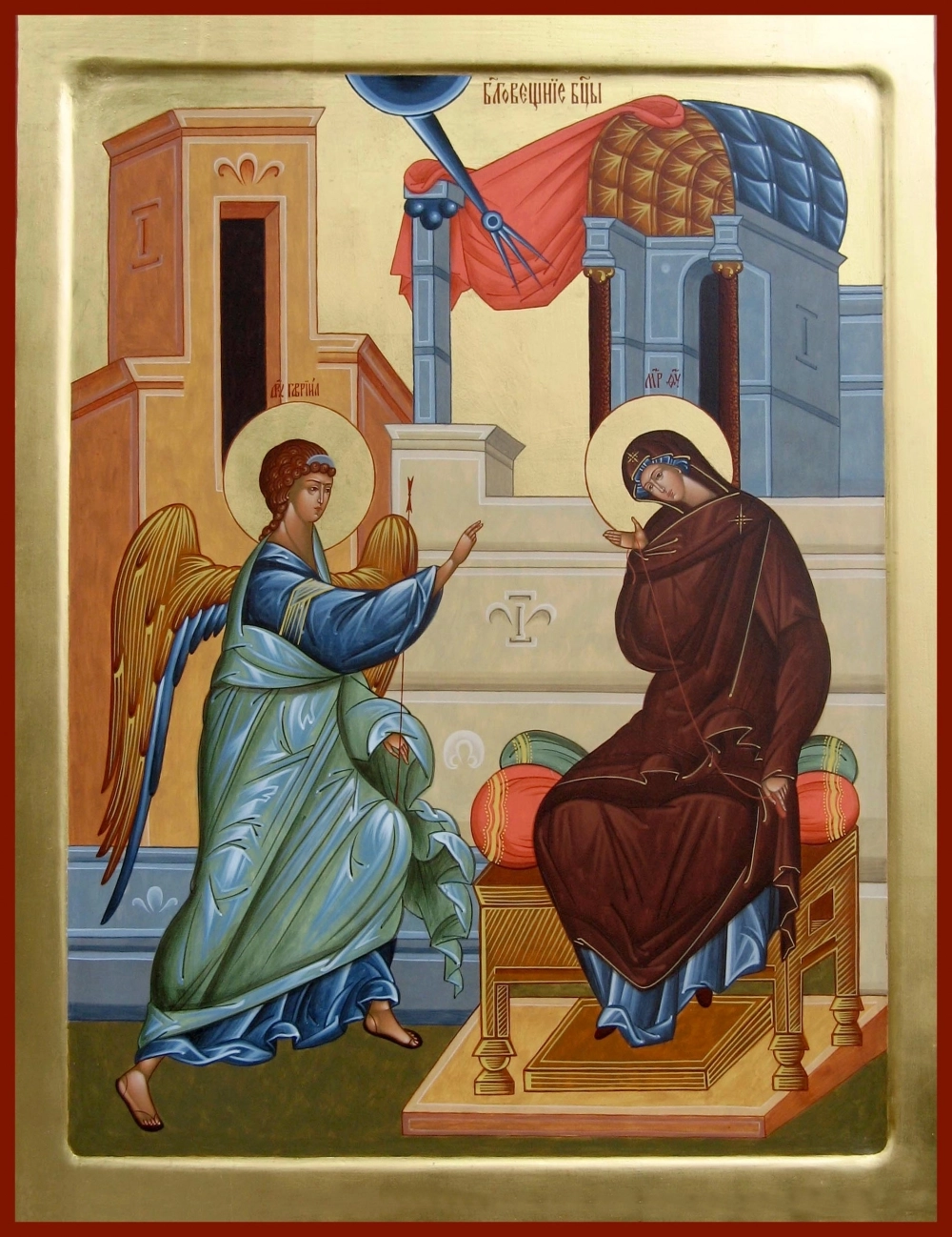 На иконах Благовещения всегда две фигуры: архангел Гавриил — в динамичной позе, с посохом вестника, и Пресвятая Богородица — часто с пурпурной пряжей в руках (символ того, что она «ткёт» из своей плоти тело Спасителя). В верхней части иконы — луч света с голубем: образ Святого Духа. Жест Богородицы — рука, раскрытая навстречу ангелу, — означает принятие воли Божьей.