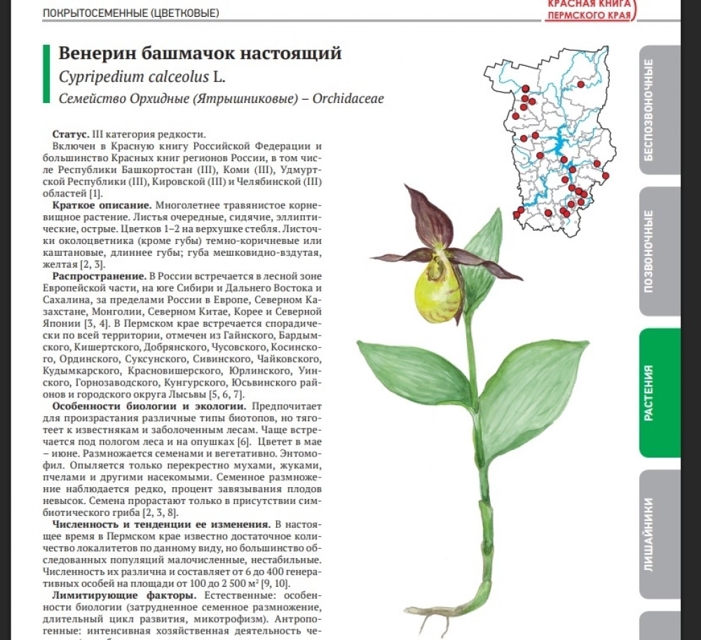 — Три вида растений считаются исчезнувшими на территории края. Первый — пролом- ник большой. Единственный гербарный образец этого вида был собран Павлом Сюзевым в 1889 г. на обрывистом берегу Чусовой, в окрестностях Кыновского завода. С тех пор, несмотря на регулярные поиски в том месте и в похожих условиях, найти его больше не удавалось. Исчезновение связано либо с туризмом, либо с естественным разрушением скал. Второй — прострел сомнительный. Известен по единственному гербарному образцу из Кунгурского района, собранному Рудольфом Камелиным в 1958 г. Сейчас он хранится в Гербарии Ботанического института РАН в Санкт-Петербурге. В природе вид не встречается более 50 лет. Третий — ятрышник обожжённый. По литературным данным, его отмечали в окрестностях Очёра и в заказнике «Предуралье», но гербарных сборов нет. И его тоже не видели больше полувека.