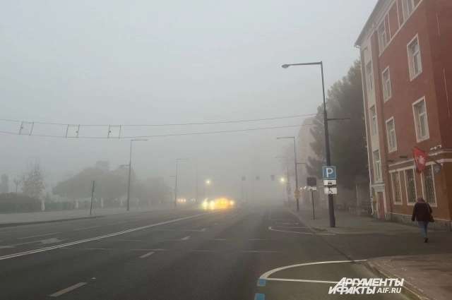 Из-за тумана видимость на дорогах Перми ранним утром была плохой. Водители автомобилей передвигались по городу со включёнными фарами.