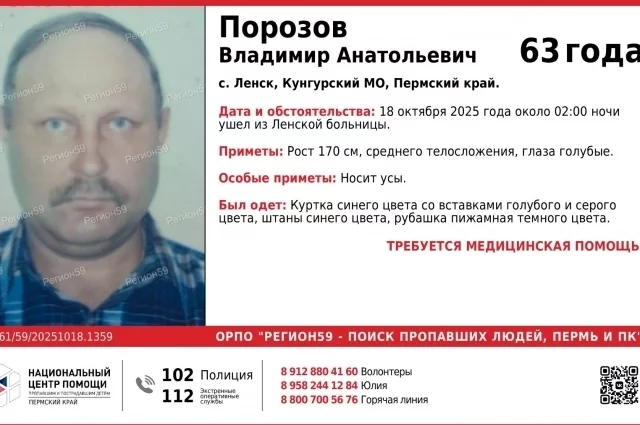 Речь идёт о 63-летнем жителе Кунгурского округа. Ранее сайт perm.aif.ru рассказывал, что Владимир Порозов ушёл из больницы в селе Ленск около 2 часов ночи 18 октября. Через два дня о пропаже мужчины сообщил поисковый отряд «Регион59 — поиск пропавших людей». Волонтёры опубликовали в социальных сетях сообщение с ориентировкой и описанием мужчины.