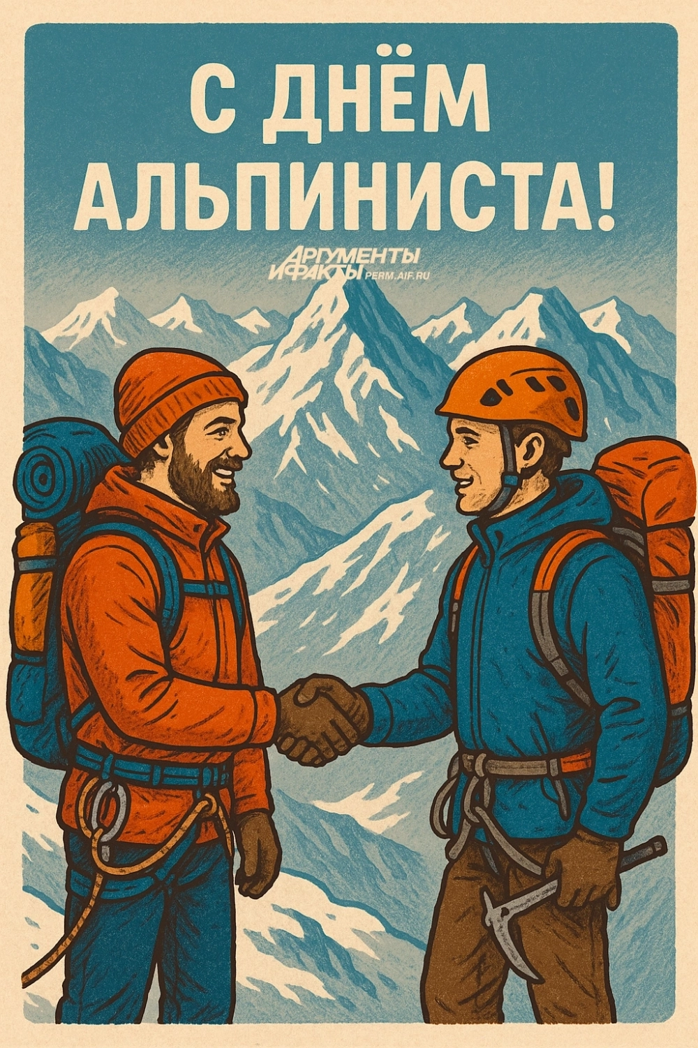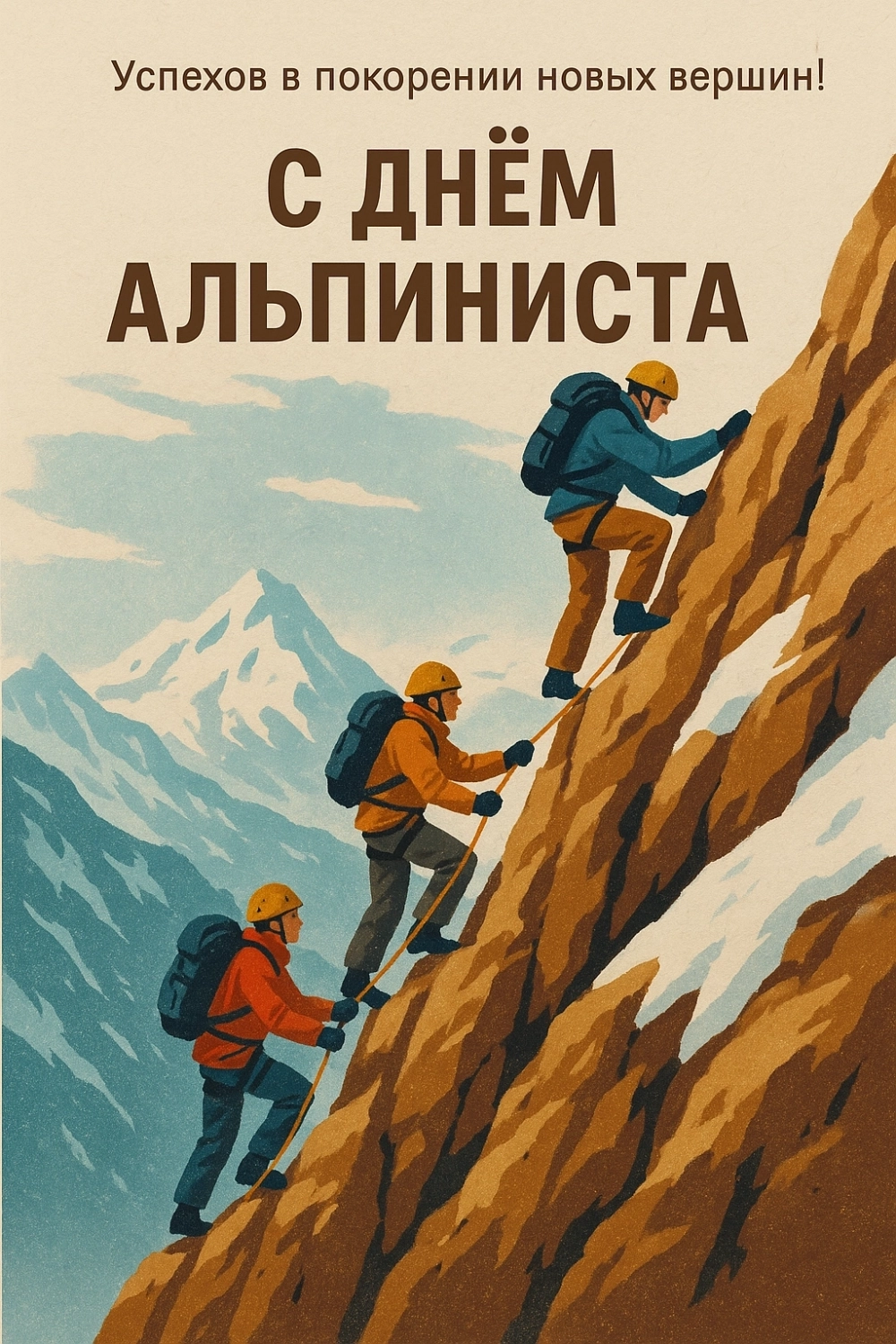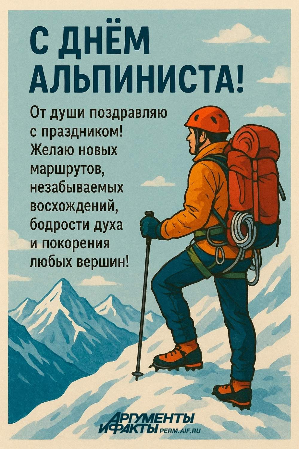 8 августа отмечается праздник — Международный день альпинизма. В 1786 году врач Мишель-Габриэль Паккард и горный проводник Жак Бальма впервые достигли высшей точки Альп — вершины Монблан, высота которой составляет 4810 метров над уровнем моря. И случилось это 8 августа. Сайт perm.aif.ru публикует открытки-поздравления с Днём альпиниста (открытки разворачиваются при клике на них для удобного скачивания).