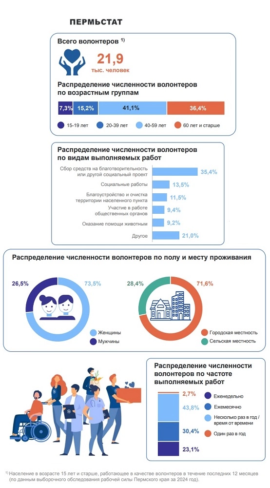 Сколько в Пермском крае волонтёров и чем они заняты? Пермьстат подготовил актуальную инфографику по данным о добровольцах в регионе.