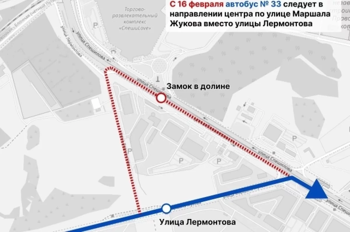 С 16 февраля автобусы маршрута перестанут выезжать на улицу Спешилова по улице Лермонтова, вместо этого следуя по более широкой улице Маршала Жукова. Таким образом, при движении в сторону центра Перми через остановочный пункт «Замок в долине» на Спешилова они больше проезжать не будут.