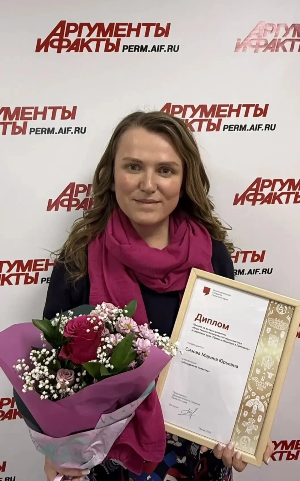 В Законодательном Собрании Пермского края наградили победителей журналистской премии «Право и общество в Прикамье» за вклад в развитие общественно-политической журналистики в регионе в 2025 году. Среди лауреатов — редактор спецпроектов «Аргументы и факты - Прикамье» Марина Сизова (Никитина), получившая награду в номинации «Молодёжная повестка».
